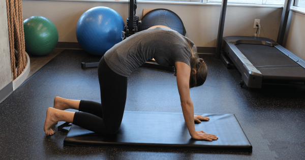 The Cat-Cow exercise is great for working on lumbar spine flexion (rounding) and extension (arching) motion in a non-weightbearing position. This can be especially helpful for people who experience pain with these movements while upright in standing or sitting.