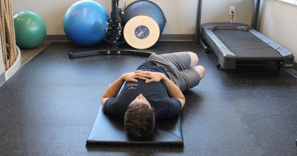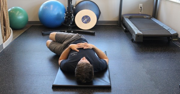 - Lie on your back with your knees bent to 90o and feet flat on the ground