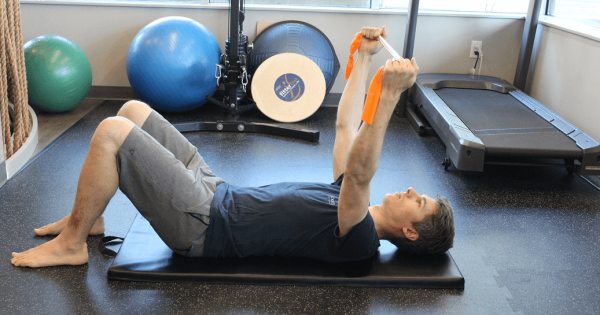 The Supine Theraband Shoulder Y’s exercise is great to increase engagement of the rotator cuff muscles with overhead movements.